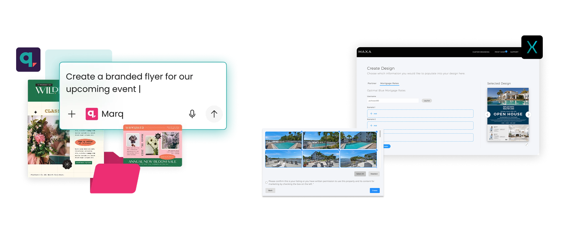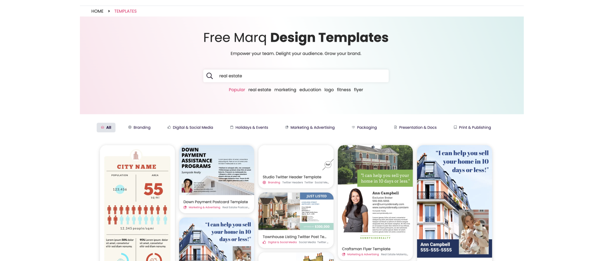 Both platforms provide agents with templates they can use. Marq emphasizes open access and adaptable designs across many categories, while MAXA leans into real-estate-specific template suites designed to give agents and brokerages more options, consistency, and speed.