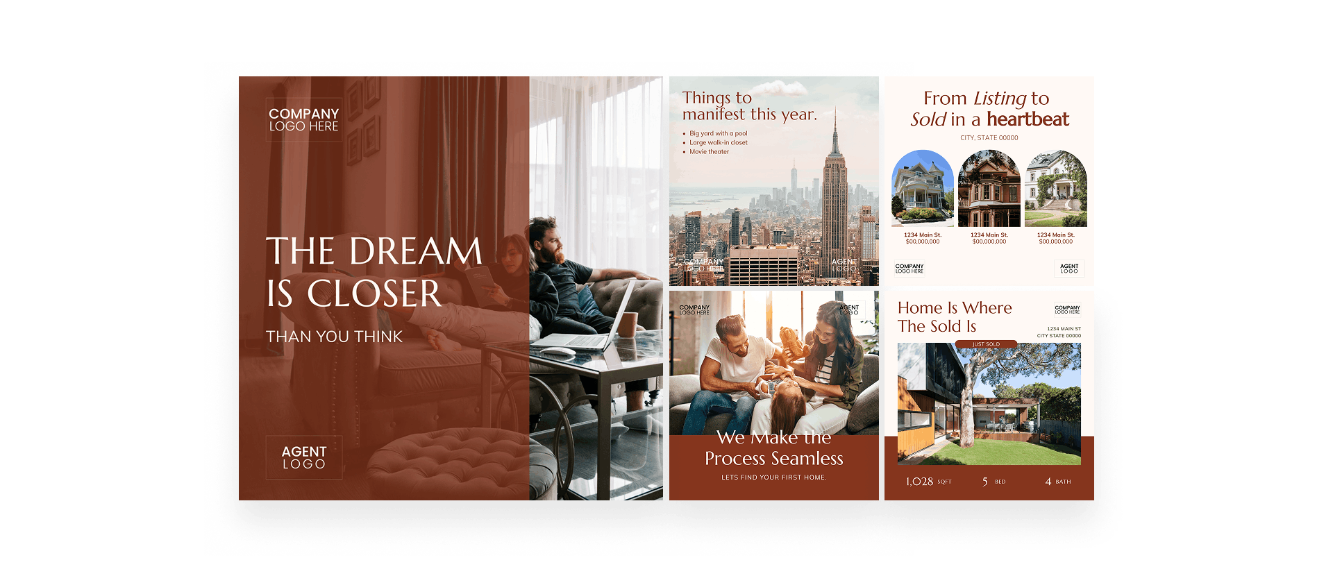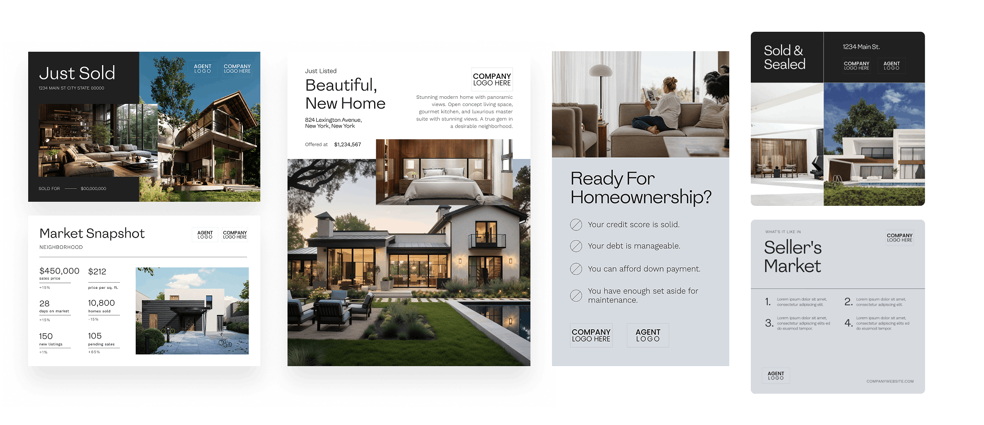 Real estate marketing templates generally fall into four core categories. Understanding these types helps agents produce consistent, on-brand assets at scale and choose the right template each time.