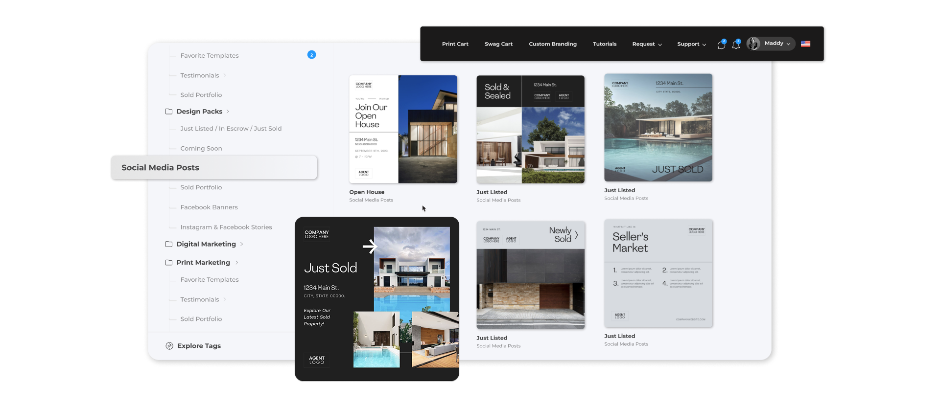 - Compliance-ready templates: Design templates featuring required disclosures, fair housing logos, and brokerage information are already in place.
